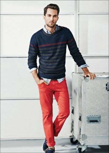 Par su pantalón rojo con una camisa blanca y un suéter azul con blanco y azul despojado sweater.Wear zapatos de color azul para completar el look. De moda y con estilo.