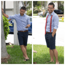 Un toque de color siempre se ve caliente. Use un azul y blanco peló la camisa azul marino con unos shorts chinos azules. Use el empate y terminar con sandalias de cuero.